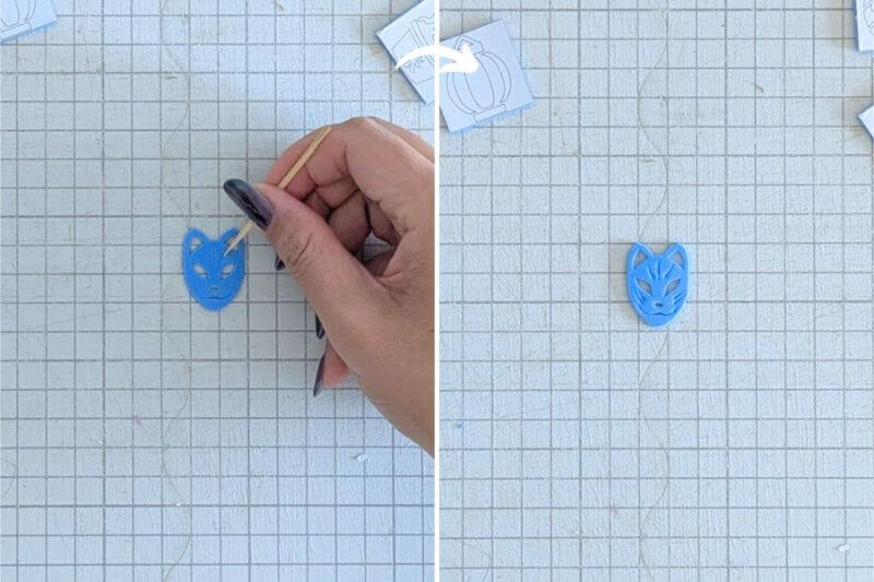 金魚とキツネのお面もつまようじで引っかくように線を引けは切り抜く必要はありません。